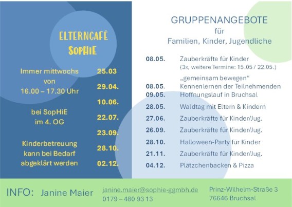 Immer mittwochs von 16.00 - 17.30 bei SopHiE. Die genauen Daten stehen unten im Flyer. Für weitere Info, wenden Sie sich bitte einfach an Frau Maier.